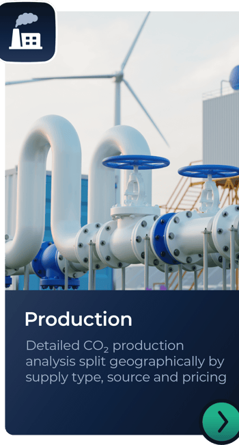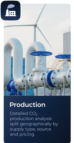 The Production Analysis feature offers detailed insights into CO2 production volumes, segmented by region, supply type, and source. It also includes Market Volumes and Market Value tools, which provide data on CO2 availability and pricing trends.