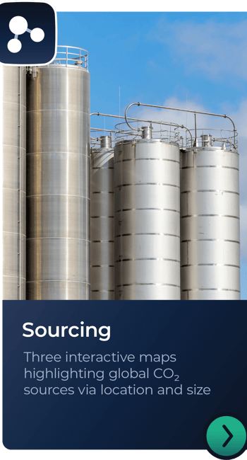 The dashboard includes Sourcing Maps, which provide interactive views of global CO2 facilities, including details such as location, size, source type, biogenic status, and associated companies. These maps allow users to filter and customise views.