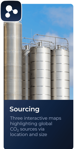 The dashboard includes Sourcing Maps, which provide interactive views of global CO2 facilities, including details such as location, size, source type, biogenic status, and associated companies. These maps allow users to filter and customise views.